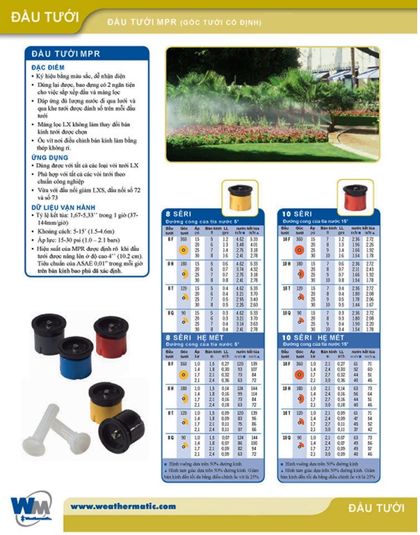 - Hiệu suất của MPR được định rõ khi đầu tưới được nâng lên độ cao 4" (10.2cm). Tiêu chuẩn của ASAE 0.01" trong mỗi giờ trên bán kính bao phủ đã xác định.