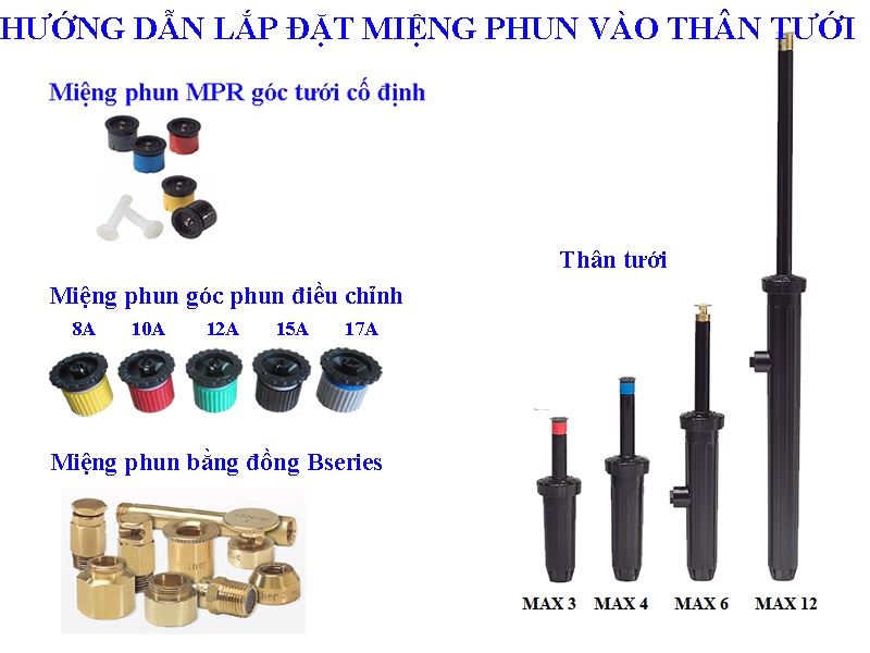 • Ren nối có thể lắp được các loại MPR, đầu điều chỉnh được góc tưới, đầu đồng MAX B, tất cả các đầu theo chuẩn công nghiệp